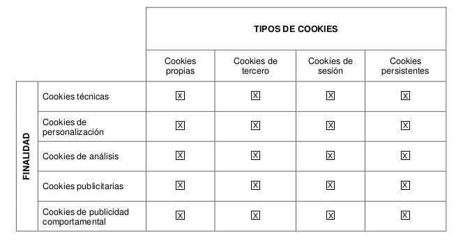 | SEGÚN SU FINALIDAD | Cookies técnicas | Son las necesarias para la correcta navegación por la web. | |